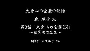 昭和20年(1945)5月29日の横浜大空襲の5日前の5月23日の夜から24日にかけて、港北区大倉山周辺で空襲があった。当時18才だった森照子さんは、港北区大倉山(当時は太尾町)の自宅で空襲に遭遇。空襲の前、空襲の当日、そしてその後のお話をしていただきました。森照子さんは、昭和2年(1927)生まれ。インタビュー撮影時の年齢は96歳。聞き手は港北区在住の俳優 五大路子さん。